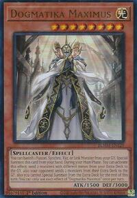 Description: You can banish 1 Fusion, Synchro, Xyz, or Link Monster from your GY; Special Summon this card from your hand. During your Main Phase: You can activate this effect; send 2 monsters with different names from your Extra Deck to the GY, also your opponent sends 2 monsters from their Extra Deck to the GY, also you cannot Special Summon from the Extra Deck for the rest of this turn. You can only use each effect of "Dogmatika Maximus" once per turn.