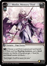 Description: REST: Choose a card from a graveyard and banish it. If that card has floating memory, put a level counter on Merlin. (Champions get +1 level for each level counter on them.)