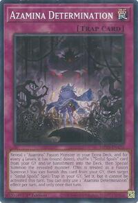Description: Reveal 1 "Azamina" Fusion Monster in your Extra Deck, and for every 4 Levels it has (round down), shuffle 1 "Sinful Spoils" card from your GY and/or banishment into the Deck, then Special Summon the revealed monster. (This is treated as a Fusion Summon.) You can banish this card from your GY, then target 1 "Sinful Spoils" Spell/Trap in your GY; Set it, but it cannot be activated this turn. You can only use 1 "Azamina Determination" effect per turn, and only once that turn.