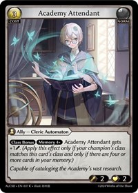 Description: [Class Bonus] [Memory 4+] Academy Attendant gets +1 power. (Apply this effect only if your champion's class matches this card's class and only if there are four or more cards in your memory.)