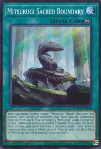 Description: Your opponent cannot target "Mitsurugi" Ritual Monsters you control with effects of monsters that were Special Summoned from the Extra Deck. You can target 4 "Mitsurugi" cards in your GY, except "Mitsurugi Sacred Boundary"; shuffle them into the Deck, then if your opponent controls a monster, make them Tribute 1 monster they control (their choice). You can only use this effect of "Mitsurugi Sacred Boundary" once per turn.