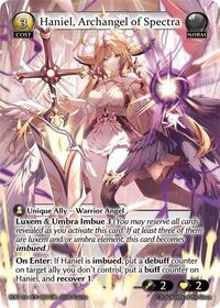 On Enter: If Haniel is imbued, put a debuff counter on target ally you don't control, put a buff counter on Haniel, and recover 1.