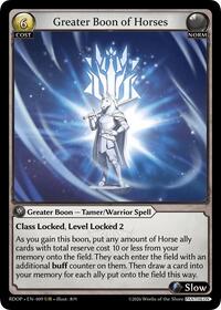As you gain this boon, put any amount of Horse ally cards with total reserve cost 10 or less from your memory onto the field. They each enter the field with an additional buff counter on them. Then draw a card into your memory for each ally put onto the field this way.