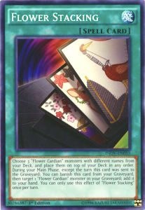 Description: Choose 3 "Flower Cardian" monsters with different names from your Deck, and place them on top of your Deck in any order. During your Main Phase, except the turn this card was sent to the Graveyard: You can banish this card from your Graveyard, then target 1 "Flower Cardian" monster in your Graveyard; add it to your hand. You can only use this effect of "Flower Stacking" once per turn.