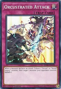 When a monster declares an attack: Tribute 1 “Orcust” or “World Legacy” monster, then target 1 monster your opponent controls; banish it.