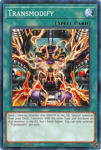 Send 1 face-up monster you control to the GY; Special Summon from your Deck, 1 monster with the same Type and Attribute as that monster in the GY, but 1 Level higher. You can only activate 1 "Transmodify" per turn.