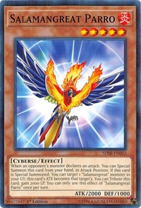 Description: When an opponent's monster declares an attack: You can Special Summon this card from your hand, in Attack Position. If this card is Special Summoned: You can target 1 "Salamangreat" monster in your GY; this card's ATK becomes that target's. You can Tribute this card; gain 2000 LP. You can only use this effect of "Salamangreat Parro" once per turn.